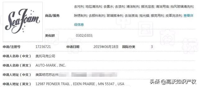 有一件這樣的商標(biāo),是美國(guó)一公司于2015年6月18日申請(qǐng)的“SEAFOAM”商標(biāo),指定使用在第3類“去污劑;擦洗溶液;地毯清洗劑;去霧水;去漆劑;清潔制劑;清潔用油;擋風(fēng)玻璃清洗劑;除銹制劑;去顏料制劑;玻璃擦凈劑;去油漬油;拋光蠟;擦亮用劑;皮革洗滌劑”商品上湖南商標(biāo)注冊(cè)。